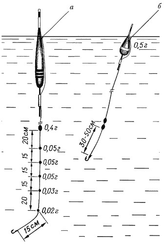 В таких случаях необходима специальная поплавочная снасть для дальнего заброса, в виде удочки с самоогружающимся поплавком, оборудованной легкой безынерционной катушкой и пропускными кольцами. Удилище должно иметь удобную пробковую рукоять. При таком оснащении можно легко забросить насадку на 10–15, а то и более метров от берега. В основании поплавка, скользящего по леске, встроен груз, позволяющий ему самоогружаться. Он фиксируется отрезком кембрика с зажимом (а лучше специальным скользящим узелком), который надевают на леску выше поплавка. Грузило-дробину навешивают в 15 см от крючка. Перед забросом поплавок с грузилом подтягивают к вершинке удилища. Замах — и наживка, увлекаемая грузилом и поплавком, летит в нужное место. Все происходит примерно так, как при манипуляциях спиннингом. Другой вариант оснастки удочки с дальним забросом показан на рис. 139. В данном случае используется обычный скользящий поплавок, а два скользящих на основной леске груза («оливки») позволяют делать дальний заброс. «Оливки» ложатся на дно. При поклевке леска в них перемещается свободно. Величину отпуска поплавка регулируют стопором, как и при ловле с самоогружающимся поплавком.