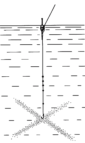 На обширных пространствах водохранилища, особенно в период глухозимья, сразу найти плотву удается редко. Предпочтение надо отдавать участкам с незначительным течением. Излучины русел затопленных речек и ручьев зачастую образовывают своеобразные подводные столы — так принято называть довольно обширные ровные площади дна (рис. 140). Желательно обследовать вначале их, причем преимущественно те, где имеется небольшой коряжник. Далее уже можно «прощупать» подводные бровки, свалы и отыскать пятачок с лудами, воронками, другими неровностями дна, где глубина колеблется в пределах 3,5–5 м, или подводную банку, т. е. ограниченное в размерах подводное плато, возвышающееся на фоне окружающих глубин. В любом случае предпочтение следует отдавать тем местам, дно которых хоть чем-то выделяется в общей картине дна водоема. Например, на Рузском водохранилище, отыскивая под водой перепады глубин вблизи русла с умеренно закоряженными местами, я часто попадал на стоянки крупной плотвы на тех участках, где затопленное русло реки проходило вблизи того или иного залива. Иногда уловистый участок оказывался у поваленного с крутого берега и вросшего в лед дерева или у затопленных кустов. Сильно заиленных, непроточных мест в период прочного ледостава плотва избегает — там наименьшая концентрация растворенного в воде кислорода. На незнакомом водоеме лучше начинать рыбалку с облова границ умеренного и спокойного течений, где преобладает галечно-песчаное дно. Ориентироваться можно на береговые обнажения горных пород, находящиеся вблизи данного места. На значительном удалении от берега полезно взять пробу грунта со дна водоема при помощи какого-нибудь примитивного приспособления. Кстати, исследование случайно оказавшегося на крючке донного мусора тоже может дать много полезной информации о режиме жизни под водой. Если веточка не облеплена живыми организмами, значит, вода на данном участке очень плохо обогащена кислородом и искать рыбу здесь не стоит. И напротив, нахождение на коряжине водорослей с шевелящимися в них личинками насекомых, как правило, говорит о том, что найден участок с хорошей кормовой базой для рыбы.