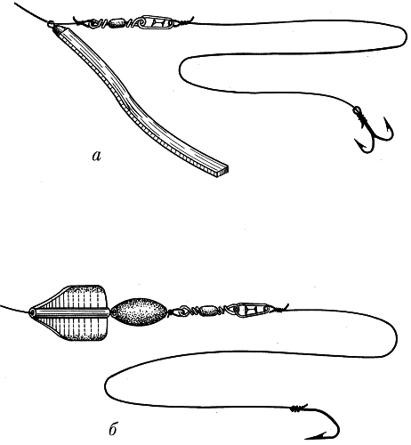 Для ловли самых крупных сомов можно использовать так называемый парашют. Это обычный резиновый мяч среднего диаметра, упакованный в прочную сетку. Сверху и снизу на сетке есть петли, к которым привязывается самая прочная леска. Длина нижней лески равняется глубине ловли плюс запас 2–3 м. Длиной верхней лески регулируют отпуск «парашюта» по течению с лодки. Потом длинный конец привязывают к воткнутому в дно колу или к кусту на повороте реки (рис. 154, а и б). Грузило, способное ограничивать движения крупного живца (от 50 до 100 г), устанавливается в 1 м от мощного кованого крючка.