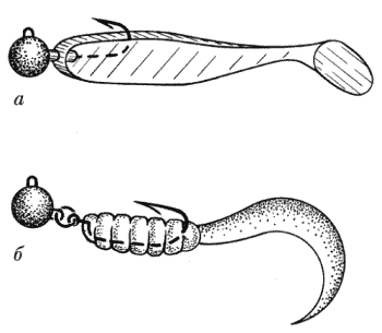 Многие судачатники Верхней Волги взяли на вооружение «Акатовскую» блесну (рис. 162). Она изготавливается из медной или латунной пластины и имеет вытянутую узкотелую форму. Длина ее составляет 12–15 см. К хвосту блесна сужена, а к тройнику несколько расширена и слегка выгнута. Одна сторона ее залита оловом таким образом, что вблизи тройника имеется утолщение. Другая сторона в соответствии с материалом пластины — желтоватого или красного цвета. На конце — тройник № 8. На цевье тройника обязательно делается опушка из шерстяной нитки обычно красного цвета. Это необходимо не столько для украшения блесны, сколько для изменения ее игры при свободном падении. При поиске судаковой «точки» обычно на одной лунке долго не играют приманкой. Здесь достаточно делать не более трех манипуляций блесной. То есть выбирают любые три уровня игры вместо пяти, а иногда ограничиваются даже двумя или одним.