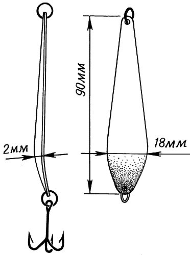 Масса оснастки зависит от дальности заброса, глубины ловли, скорости течения, наличия ветра. На совершенно спокойной, малопроточной воде при ловле у поверхности, когда уклейку можно подманить к берегу прикормкой, применяют самое короткое удилище, желательно с пробковой рукоятью. Длина его — от 1,5 до 3,5 м. В этом случае на бесповодковую леску диаметром 0,06–0,07 мм ставят поплавок массой 0,6 г вытянутой формы. Огрузка рекомендуется такая: нижнее грузило — 0,1 г, второе — 0,2, третье — 0,3 г. Если на тихой воде ловят более длинным удилищем, например 4–5-метровым, то для удобства заброса ставят поплавок массой не менее 1 г и используют большее количество дробинок: нижняя — 0,1 г, вторая — 0,2, третья — 0,3, четвертая — 0,4 г. Ловить на достаточно быстром течении с сетчатой кормушкой либо быстро опускающимися шарами прикормки приходится так, чтобы насадка находилась на небольшом удалении от дна. Причем при короткой проводке требуется как можно более быстрое опускание насадки. Сделать это позволит оснастка, показанная на рис. 165.