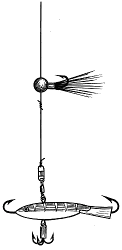 Бывает, что уклейка держится в отдалении. Рыболов видит стайку, но ее очень трудно привлечь кормом на расстояние, достаточное для ловли на удочку с глухой оснасткой. Особенно часто такая ситуация возникает, когда рыболов находится у длинных отмелей с прозрачной водой. В этом случае выручает хорошо отрегулированная удочка с самоогруженным поплавком, центр тяжести которого смещен книзу, антенна же очень длинная и имеет на конце заметный издали шарик. Для такой ловли хорошо использовать максимально облегченное матчевое удилище, способное посылать на расстояние не менее 20 м оснастку общей массой 3 г (2,5 г поплавок + 0,5 г дополнительное грузило с крючком). Расстояние от крючка до грузила — 5–10 см. Основная окраска поплавка — зеленоватая или голубоватая. Катушка — безынерционная, суперлайт. Для облегчения схода лески лучше сматывать часть ее на руку и производить заброс по типу нахлыстового.