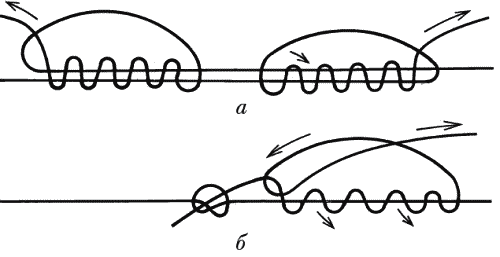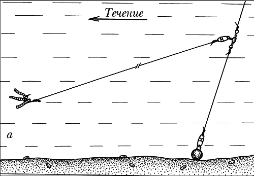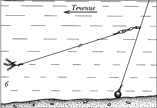 Рис. 216. Скользящая оснастка поводка для ловли на течении: а — с «оливкой»; б — с «пирамидкой»