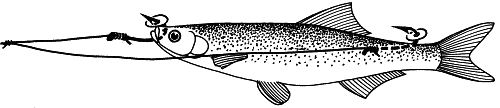 Несколько слов хотелось бы сказать о верхнем поводке. На него лещ почему-то попадается реже всего. Но если верхний поводок удлинить до размеров 25–30 см, то он становится более эффективным. Однако тогда возникает трудность с забросом — поводок путается. В этом случае я вминаю леску поводка в эластичную массу корма так, чтобы свободной лески возле крючка оставалось не более 1–2 см. Если нижний поводок длинный, его также имеет смысл фиксировать в бомбочке корма (рис. 229). И тогда после достижения дна происходит следующее: корм начинает размывать течением, а поводки освобождаются.