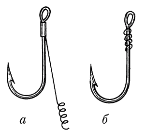 Рис. 32. Оснастка крючка по принципу бойлов: а — волосяная с силиконовым кембриком и пружиной; б — с пружиной на цевье крючка