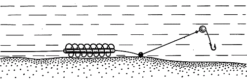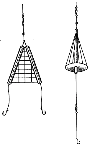 Рис. 38. Кормушка и оснастка для ловли на заиленном дне
