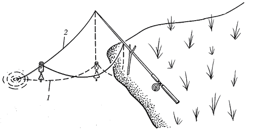 Рис. 41. Способ фиксации колокольчика: 1 — стационарное положение; 2 — поклевка