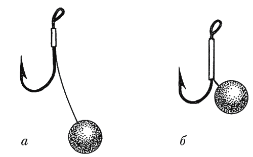 Карася, как и карпа, можно с успехом ловить на бойлы. Разработка этой оснастки начиналась с бойлов, закрепленных непосредственно на цевье крючка. Сейчас чаще применяют бойлы, прикрепленные к крючку на волоске. Волосок — это короткая мягкая толстая леска маскировочного цвета (черного, коричневого или зеленого), сплетенная из множества мелких лесок. Отмечено, что лучшую зацепляемость крючки показывают в тех случаях, когда волосок отходит от середины цевья. Для этого необходимо удлинять крепежный кембрик (рис. 42).