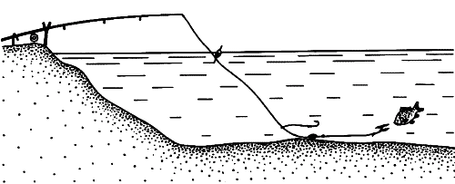 Как известно, карась зиму проводит в ямах на глубине, но во время оттепелей он выходит покормиться на столы, расположенные недалеко от зимовальных ям, на глубину 1,5–2,5 м. Можно поискать карася на аналогичных участках, вблизи старого русла (рис. 45). Еще он предпочитает рытвины, ложбины и различные неровности на этих столах и прибрежных, средней глубины, участках. Летние места с коряжником, где любит держаться крупный карась, в зимние оттепели его также прельщают.