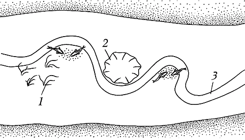 При подвижной оснастке используют скользящий поплавок и различные комбинации грузил. Нередко на леску устанавливают плавно тонущее грузило, что позволяет применять поплавок с меньшими тестовыми характеристиками. Такая удочка удобна для ловли в глубоких местах и на большом удалении от берега. Обычно, чтобы избавить леску от лишнего трения, движение поплавка ограничивают, устанавливая ниже него дробинки. Расстояние от дробинки до крючка должно быть на 1 м меньше длины удилища для удобства заброса насадки (рис. 48).