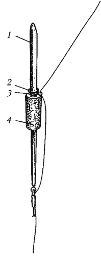 Рис. 46. Самодельный поплавок для дальнего заброса из гусиного пера и пробки: 1 — ствол гусиного пера; 2 — резиновое колечко; 3 — «восьмерка» из жести; 4 — пробка