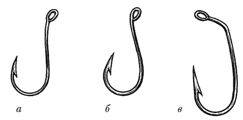 Рис. 47. Разновидности крючков: а — стандартный; б — норвежский; в — японский