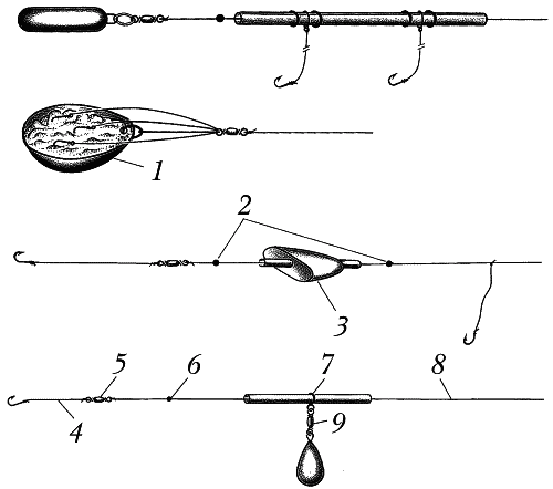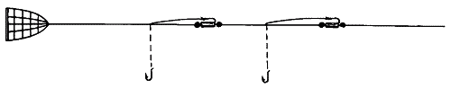 Лучше, если кормушка легко отсоединяется от основной лески. Тогда, используя различные открытые катушки (часто с неодинаковой вязкостью корма), а также комбинацию типов кормушек, можно правильнее закармливать выбранный участок ловли. Нередко вначале главной задачей рыбалки является создание на дне концентрации корма, необходимой для привлечения рыбы, а затем, по мере надобности, поддержание его количества с помощью других способов прикормки. Для этого прежде всего применяют большую кормушку с легко вымываемым кормом и лишь потом присоединяют легкую кормушку, способную подпитывать кормленый участок в достаточной мере. Чтобы поводки не мешали на первом этапе, крючки необходимо зацепить за туго скользящий по основной леске кембрик (рис. 56).