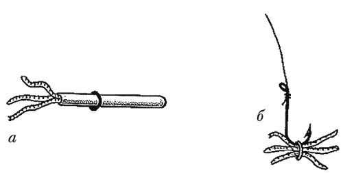 Рис. 60. Насаживание на крючок пучка мотылей; с помощью: (а ) трубочки и (б ) фиксирующего резинового колечка