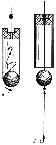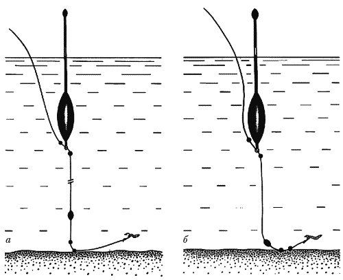 Рис. 69. Оснастка для поплавка Driftbeater: а — в тихую погоду; б — при сильной волне