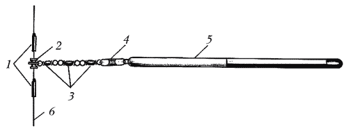 Рис. 68. Вариант глухой оснастки лещовой удочки: 1 — фиксированные кембрики; 2 — муфта для крепления вертлюжка; 3 — три последовательно установленных вертлюжка; 4 — карабин; 5 — поплавок; 6 — леска