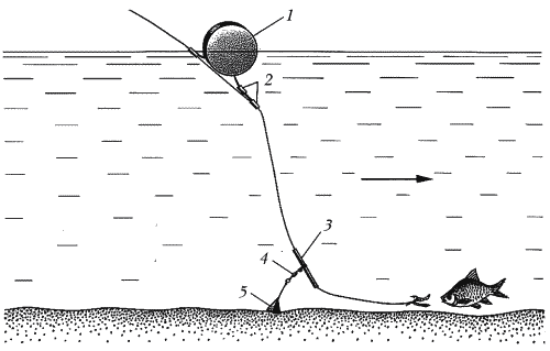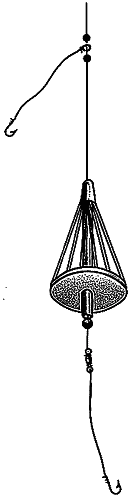 При ловле на течении не всегда используют плоские груз-кормушки, которые надежно ложатся на дно. Иногда, особенно на каменистых грядах, применяют перекатывающуюся оснастку (рис. 76). Поскольку глаз леща замечает все, что плывет возле дна, он быстрее среагирует на то, что перекатывается, а потом замирает, наткнувшись на препятствие.