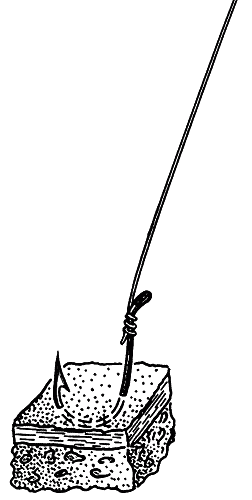 Для ловли зимой на течении используют оснастку с грузилом «оливкой» или с концевым грузилом, имеющим ушко (рис. 87). Во втором варианте длинный, до 1,5 м, поводок устанавливают на 15–20 см выше грузила. Длина его зависит от силы течения и должна позволить насадке привлекательно двигаться из стороны в сторону. Иногда к концу такого поводка привязывают довольно тяжелую мормышку. Величину поплавка подбирают таким образом, чтобы течение не утягивало его под воду. На сильном течении часто приходится пользоваться вместо поплавка достаточно упругим кивком, сделанным на конус из часовой пластины. На течении лещ берет довольно уверенно и при поклевке сдвигает грузило с места, приподнимая кивок, либо активно тянет за поводок, прижимая кивок книзу.