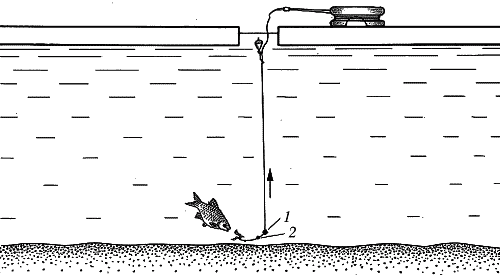 Рис. 86. Как только лещ захватывает насадку, поплавок поднимается вверх: 1 — основное грузило; 2 — дополнительное грузило при ловле на большой глубине