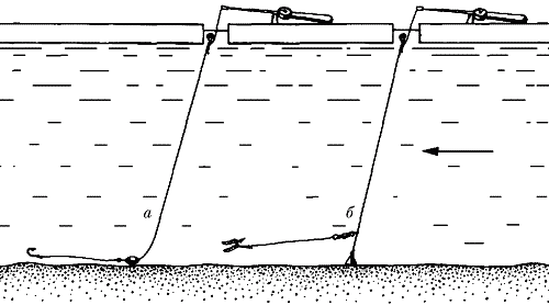 Рис. 87. Оснастка для ловли на течении: а — с грузилом-«оливка»; б — с грузилом, имеющим ушко