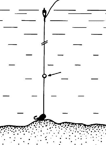 Выбор поплавка определяется силой ветра, высотой волны, поверхностным и низовым (придонным) течением. При ловле на небольших глубинах, от 0,5 до 2 м, можно использовать длиннокилевые или, наоборот, длинноантенные поплавки, напоминающие по форме тела вытянутый эллипс или детскую юлу. Крепят их в двух местах — снизу киля и через ушко в теле (рис. 95). Окружают поплавки дробинками, расположенными: первая в 10–20 см от крючка, вторая — на расстоянии 30–40 см и третья — в 70 см от него. В ветреную погоду грузила смещают ближе к крючку.