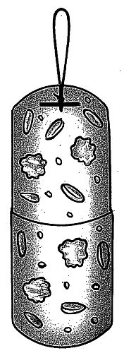Принцип ледяной «бомбочки» основан на замораживании прикормки подобно тому, как замораживают кусочки льда для коктейлей. В коробочке от киндер-сюрприза делают отверстие и вставляют в него проволочку, скрученную буквой «Т». На конце проволочки должна быть петля для крепления к снасти. После этого в коробочку «заливают» корм — кашу, зерна кукурузы или другую смесь — и помещают в морозилку. Когда прикормка замерзнет (рис. 107), ее укладывают в сумку-холодильник и отправляются на рыбалку. Таким образом можно заготовить несколько коробочек. Перед забросом снасти упаковку слегка нагревают, чтобы содержимое отделилось от стенок. Затем замороженный брикет в форме цилиндра пристегивают к основной леске и забрасывают в воду, где он размораживается в течение нескольких минут. При этом необходимо оснастить «бомбочку» небольшим грузилом-«капелькой», чтобы после освобождения прикормки натяжение лески не ослабло.
