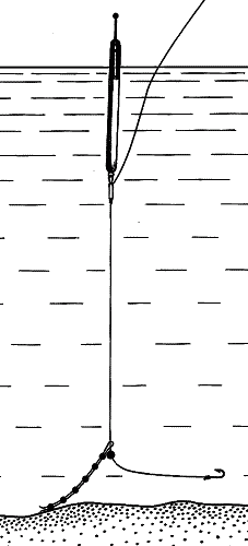 На мелководье часто применяют прозрачный поплавок-иглу из легкой прозрачной пластмассы (рис. 109). Его огружают дробинками с двух сторон. Три-четыре небольшие дробинки располагают на основной леске так, чтобы расстояние между ними книзу уменьшалось в геометрической прогрессии. Если между нижними двумя дробинками при ловле на небольшой глубине можно установить расстояние 10 см, то между второй и третьей дробинками оно будет составлять уже 20 см и т. д. Это нужно для предотвращения перехлеста лески, который часто случается при дальних забросах. Можно менять расположение дробинок и в случае необходимости добиться того, что последняя или будет лежать на дне, или находиться чуть выше дна, или слегка касаться его.