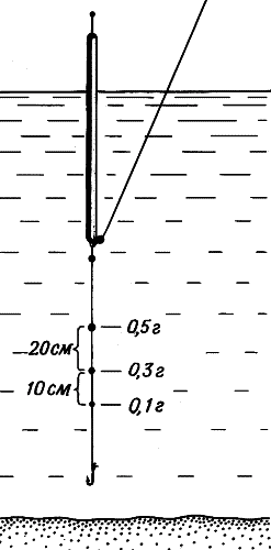 Иногда для обозначения насадки ее приподнимают над дном шариком пробки, закрепленным на поводке вблизи крючка. Высота подъема насадки должна быть в пределах 7–10 см.