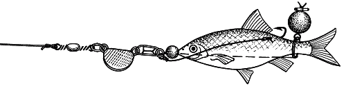 Иногда, чтобы обнаружить налимью тропу, полезно поблеснить. Опытные рыболовы применяют для ловли налима тяжелые блесны. Они говорят, что этого хищника привлекает тупо постукивающая о камни железка. Именно поэтому лучше использовать блесны, залитые мягким свинцом. Всегда лучший результат при такой ловле дает подсадка на крючок блесны пучка червей, кусочка свежей рыбки, рыбьих потрохов или небольшого живца. Самая эффективная оснастка, на мой взгляд, — это тандем блесны и прикрепленной к ней на 15–20-сантиметровом поводке мормышки с крючком № 6–10. Наживка надевается как на крючок блесны, так и на крючок мормышки. Причем желательно использовать одновременно две разные насадки — например, на крючок блесны наживлять полоску мяса, а на мормышку — пучок червей.