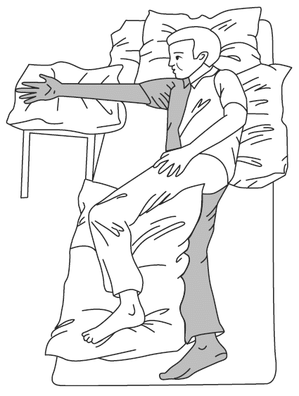 3. Пораженная рука лежит на подушке, она слегка отведена от туловища, разогнута в локте, запястье и пальцы выпрямлены.