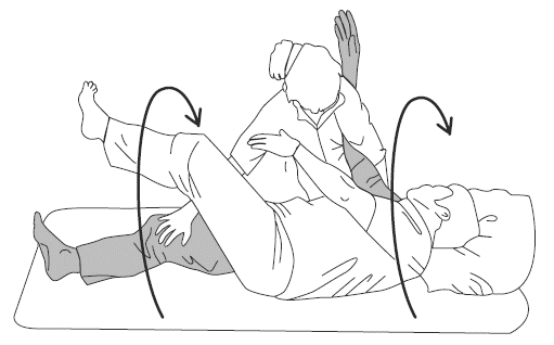 1. Помощник придерживает пациента за пораженные плечо и колено.