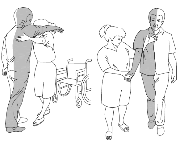 5. Помощник стоит с пораженной стороны и поддерживает плечо и руку пациента.
