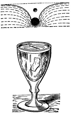 Теперь подсчитаем объем водяного слоя, возвышающегося над краями бокала. Диаметр бокала 9 см = 90 мм. Площадь такого круга равна около 6400 кв. мм. Считая, что толщина поднявшегося слоя только 1 мм, имеем для его объема 6400 куб. мм; это больше объема булавки в 1200 раз. Другими словами, «полный» бокал воды может принять еще свыше тысячи булавок! И действительно, осторожно опуская булавки, можно погрузить их целую тысячу, так что для глаз они словно займут весь сосуд и будут даже выступать над его краями, а вода все-таки еще не будет выливаться.
