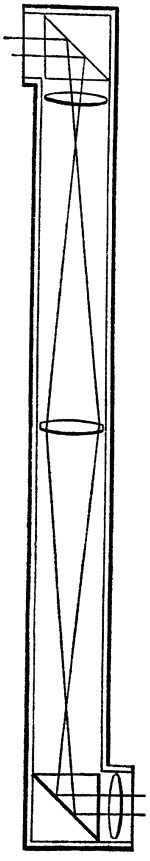 Капитан подводной лодки наблюдает за атакуемым судном также посредством перископа – длинной трубки, конец которой выступает над водой. Эти перископы гораздо сложнее, чем сухопутные, но сущность та же: лучи отражаются от зеркала (или призмы), укрепленного в выступающей части перископа, идут вдоль трубы, отражаются в нижней ее части и попадают в глаз наблюдателя (рис. 54).