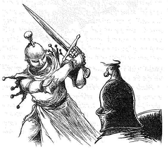 Следующим был уже виденный мною разряженный в пух и прах рыцарь, и я понимал, что победить его будет нелегко. С первого же удара я вышиб его из седла, но он быстро вскочил на ноги и стремглав бросился на меня, как гончий пес, которому подпалили хвост. Толпа взревела, когда он налетел на меня, подняв свой палаш.