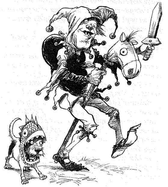 Больше всех галдел шут — невысокий человечек с бубенцами на дурацком колпаке и трескучим голосом: он верещал пронзительнее, чем принцесса, которую застали восседающей на горшке. Оседлав детскую лошадку на палочке и размахивая грубо обтесанным деревянным мечом, он скакал по залу, ведя потешный бой с маленьким терьером, обряженным Змием.
