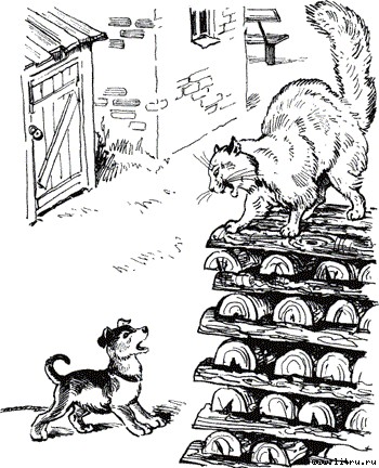 Вдруг с поленницы прямо на Пирата свалился Горыныч. Кешка выпустил поводок. Потом они с Толиком бросились было спасать щенка, но Горыныч так громко зашипел и так распушил свой хвост, что столкновение с ним грозило кончиться плохо. Пират пустился бежать, но Горыныч одним прыжком настиг его и повалил. Щенок жалобно заскулил, а кот стал над ним, покатал его лапой, словно клубок ниток, и уселся рядом.