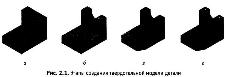 В общем случае порядок создания модели включает в себя формирование основания (рис. 2.1. а), добавление и удаление материала детали (рис. 2.1. б и в), создание дополнительных конструктивных элементов (рис. 2.1. г), построение массивов элементов и т.д.