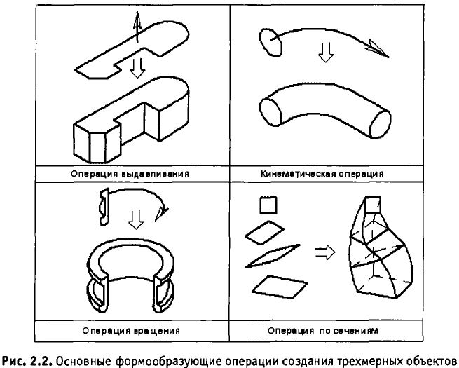 Объемные элементы образуются в результате операций — формообразующих перемещений эскизов. В основе операций лежат показанные на рис. 2.2 способы создания трехмерных объектов.