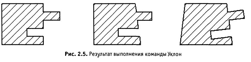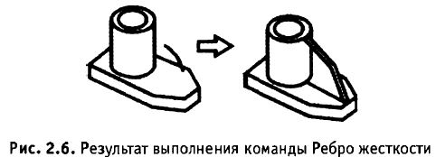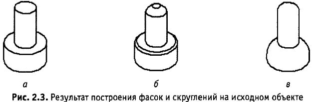 К командам формирования дополнительных конструктивных элементов относятся команды создания фасок, скруглений, круглых отверстий, уклонов и ребер жесткости. На рис. 2.3, а показан исходный объект, а на рис. 2.3, б и в — тот же объект после создания фаски и скругления.