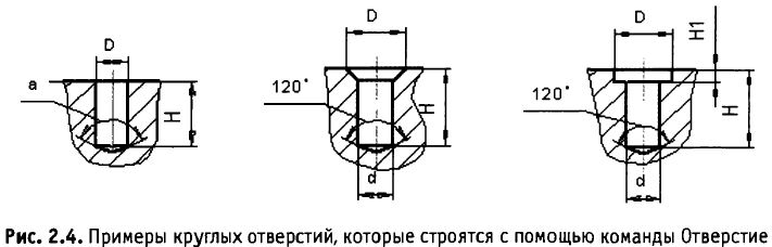 На рис. 2.4 показано несколько из предлагаемых 14 вариантов форм круглых отверстий, создаваемых с помощью команды Отверстие. Буквами обозначены параметры, которым присваиваются необходимые численные значения.