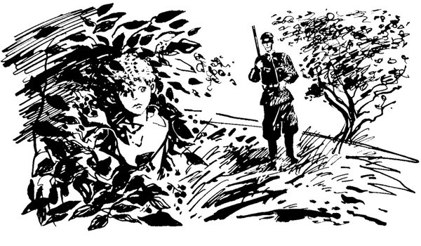 Утром третьего дня Давид спустился с дерева с восходом солнца. Он уже понимал, что потерял ребят навсегда. Он опять напился из ручья, съел два последних яйца, которые были в дупле, и ушел с этого места. На этот раз он шел очень долго. Глаза отчаянно искали просвет, который появляется, когда приближаешься к опушке леса, но просвета не было. Наконец он устал и сел, выбившись из сил. Но тут послышался какой-то шорох. Давид быстро спрятался в кустах. Из своего укрытия он увидел человека в форменной кепке и зеленом пиджаке, который шел через лес с винтовкой через плечо. Это, наверно, лесник, подумал Давид. Тот, который выдает еврейских детей немцам. Он, наверно, идет домой. Но где живут лесники? В лесу или в деревне? Давид решил проследить. Он стал красться за этим человеком, и вскоре тот, сам того не зная, вывел его на утоптанную тропу. Пройдя еще немалое расстояние, Давид увидел наконец бледный свет между деревьями. Он подождал, пока лесник исчез, и лишь тогда вышел из леса.
