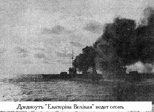 В наибольшей степени пострадала шедшая замыкающей в строю дредноутов-черноморцев "Императрица Екатерина Великая". Линкор всё более отставал от передних мателотов из-за выведенной из строя в начале сражения левой холодильной машины, а также получаемых под обстрелом в большом количестве новых повреждений. Огонь по "Екатерине" вели сразу пять больших вражеских кораблей - два больших двухтрубных линкора слева по борту и три линейных трехтрубных крейсера - по правому. Командир "Екатерины" капитан 1-го ранга Василий Михайлович Терентьев дал указание старшему артиллерийскому офицеру сосредоточить огонь на третьем японском линкоре, повернув все башни налево. На правый борт стреляли лишь казематные орудия, расчеты которых надеялись, что их 130-мм снаряды всё же долетят до врага, хотя вряд ли причинят серьезный ущерб громадным крейсерам-дредноутам.