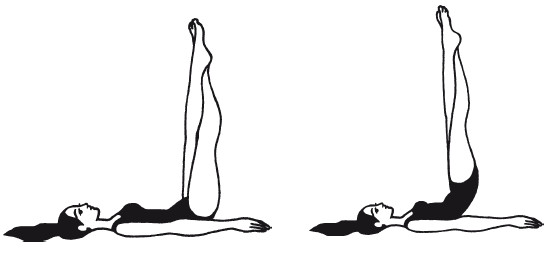 ИП – лежа на спине, руки под головой, ноги согнуты в коленях и подняты вверх так, чтобы углы между бедрами и телом и между голенями и бедрами были по 90 градусов. Ноги соединены вместе.
