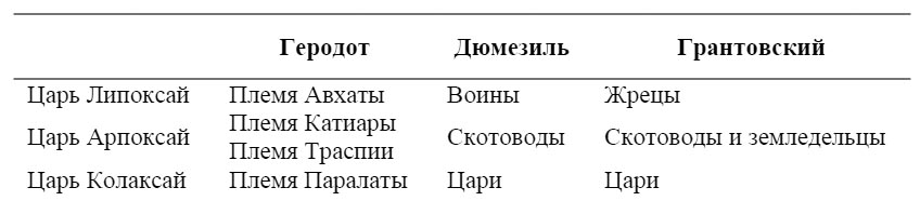 Раевский Д. С. Очерки…, с. 28, 70–73. «Этнологическим содержанием версий ГI и ВФ скифской легенды (горизонт IIIб) является обоснование трехчленной сословно-кастовой структуры общества, состоящего из военной аристократии, к которой принадлежат и цари, жрецов и свободных общинников — скотоводов и земледельцев. Эта структура моделирует строение вселенной, каким его мыслит скифская мифология» (там же, с. 71).