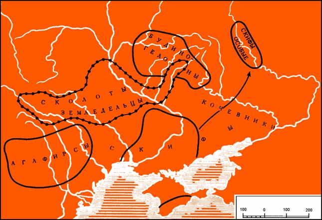 Итак, мы получили право именовать днепровско-днестровский массив земледельческих культур скифского времени и скифского облика его самоназванием — сколотами. Южная граница сколотов — степь с ее собственно скифским кочевым населением; восточные соседи — гелоны, вероятно, включившие в свой союз сколотских поселенцев на Ворскле [206] . Неясными для нас остаются северная и западная границы распространения собирательного имени «сколоты». Наиболее вероятно, что объединение трех или четырех племен под общим именем, происходившее за несколько веков до похода Дария, отвечает единству чернолесской культуры X–VIII вв. до н. э., в которой можно усмотреть четыре локальные группы: тясминскую (с наибольшим количеством крепостей), киевскую, подольскую и ворсклинскую (наиболее позднюю).