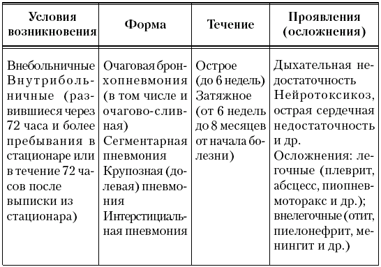 Лечение. Комплексная терапия острых пневмоний включает: обязательное и по возможности раннее применение этиотропных средств, воздействующих на подавление и ликвидацию инфекции; аэротерапию, оксигенотерапию для борьбы с гипоксией; средства и методы, улучшающие бронхиальную проходимость и восстанавливающие дренажную функцию бронхов; средства, положительно влияющие на транспорт кислорода кровью; средства, улучшающие процессы тканевого дыхания; применение средств, повышающих иммунореактивность, улучшающих обменные процессы, способствующих нормализации гомеостаза.