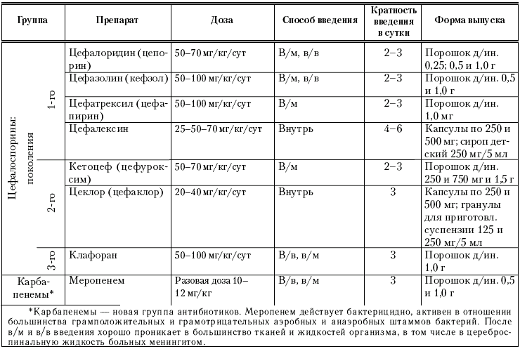 Цефалоспорины четвертого поколения – тиенам, меронем и др. Доза цефалоспоринов составляет 50–80–100 мг/кг в сутки; дозу делят на 2–3 приема, длительность курса лечения – 7–10 дней (табл. 15).Таблица 15