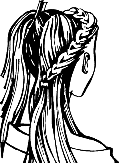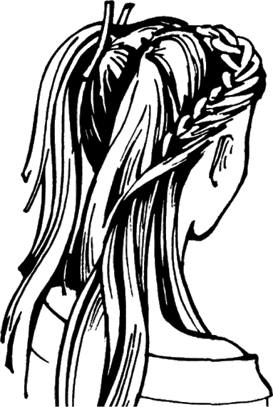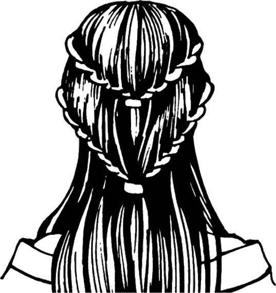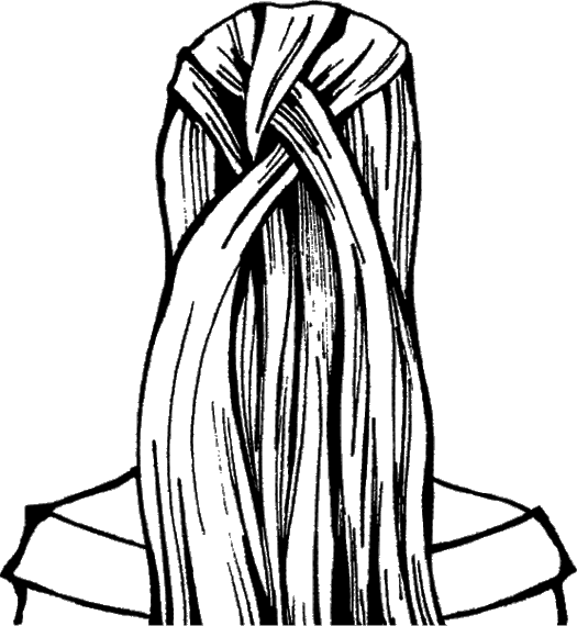 5. Повторите шаги 2–4 с левой стороны. Следите, чтобы плетение шло строго симметрично правой косе. 6. Свободные концы обеих косичек должны сойтись у шеи. Соедините их и скрепите вместе под одной резинкой или заколкой (рис. 110)