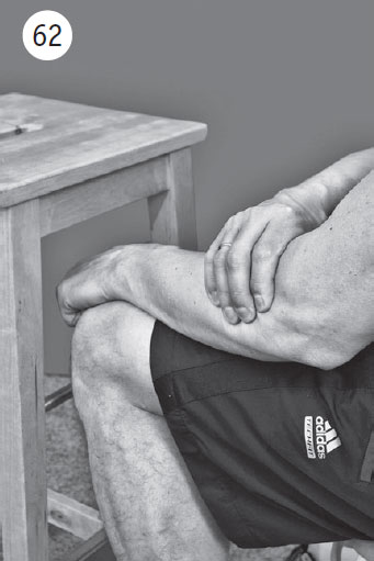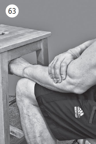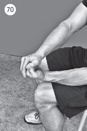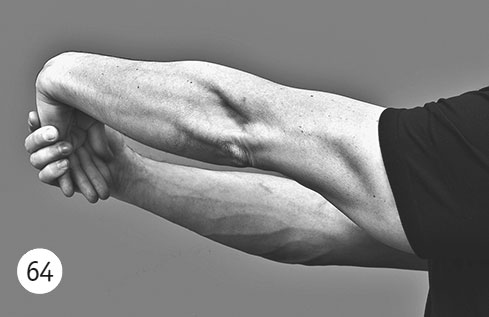 Фаза изометрического напряжения: тылом кисти вы пытаетесь как бы поднять крышку стола, поворачивая кисть в лучезапястном суставе. Одновременно придавливаете пальцами здоровой руки болезненные мышцы и сухожилия. Такое придавливание значительно уменьшает болевой синдром и позволяет перенести большую нагрузку. Удерживайте положение изометрического напряжения 20–30 секунд.
